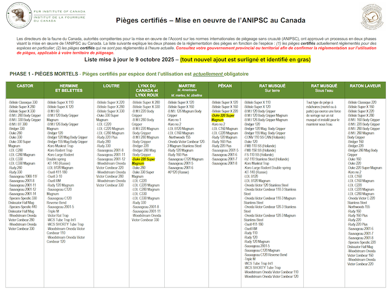 L’IFC publie et met à jour régulièrement des listes de pièges et de systèmes de piégeage qui répondent aux exigences de l’ANIPSC et dont l’utilisation a été certifiée. En janvier 2024, 248 modèles de pièges ont été certifiés, dont 178 pièges à tuer pour neuf espèces et 70 pièges à capturer des animaux vivants pour six espèces.